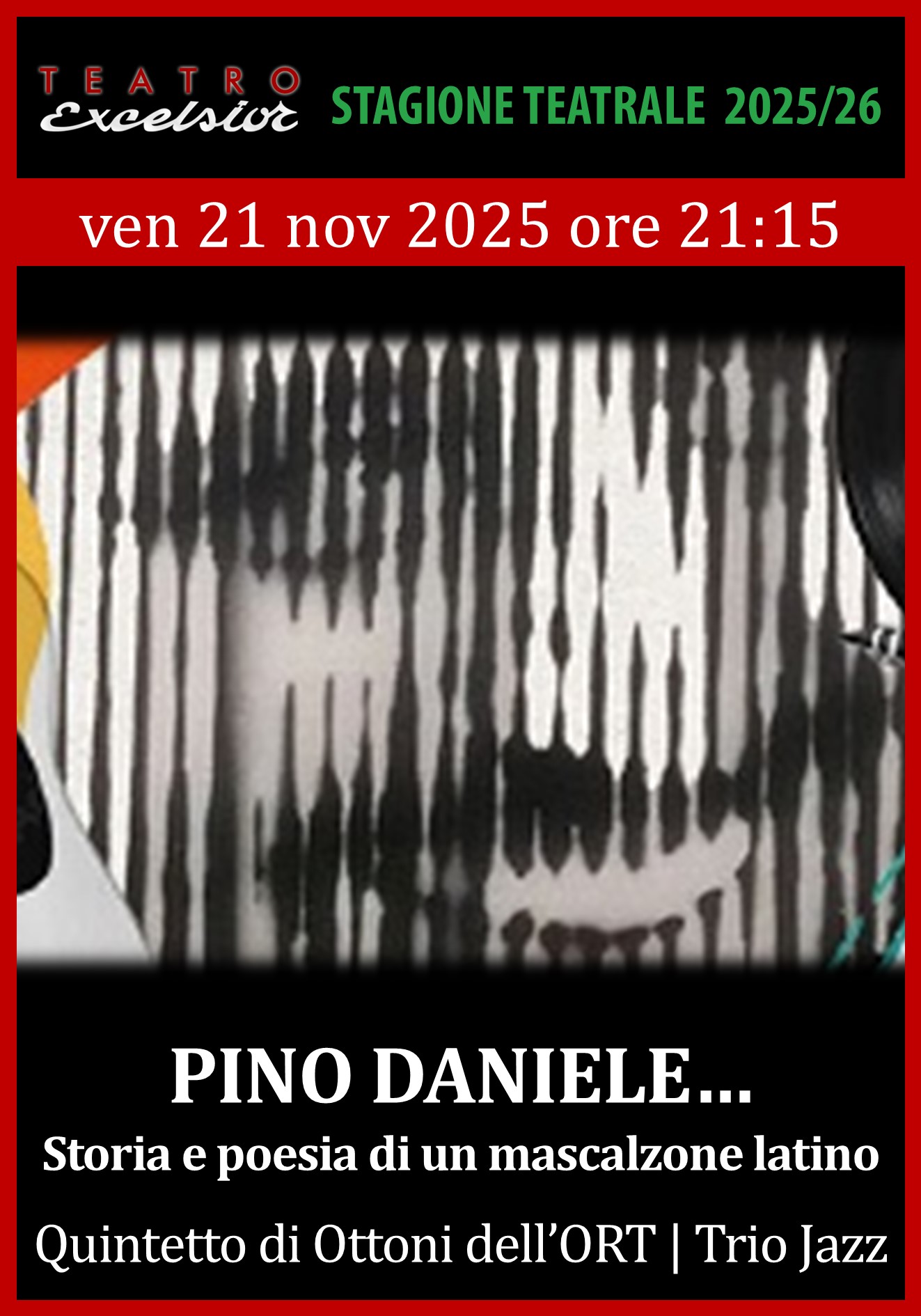 È un omaggio commovente e potente al genio musicale di Pino Daniele, a dieci anni dalla sua scomparsa e in occasione dei settant’anni dalla sua nascita. Gli Ottoni dell’ORT insieme alla formazione del Trio Jazz accompagnano la straordinaria voce di Nadyne Rush, con arrangiamenti originali firmati da Demetrio Bonvecchio, regalando al pubblico una rilettura unica delle canzoni indimenticabili del cantautore napoletano.